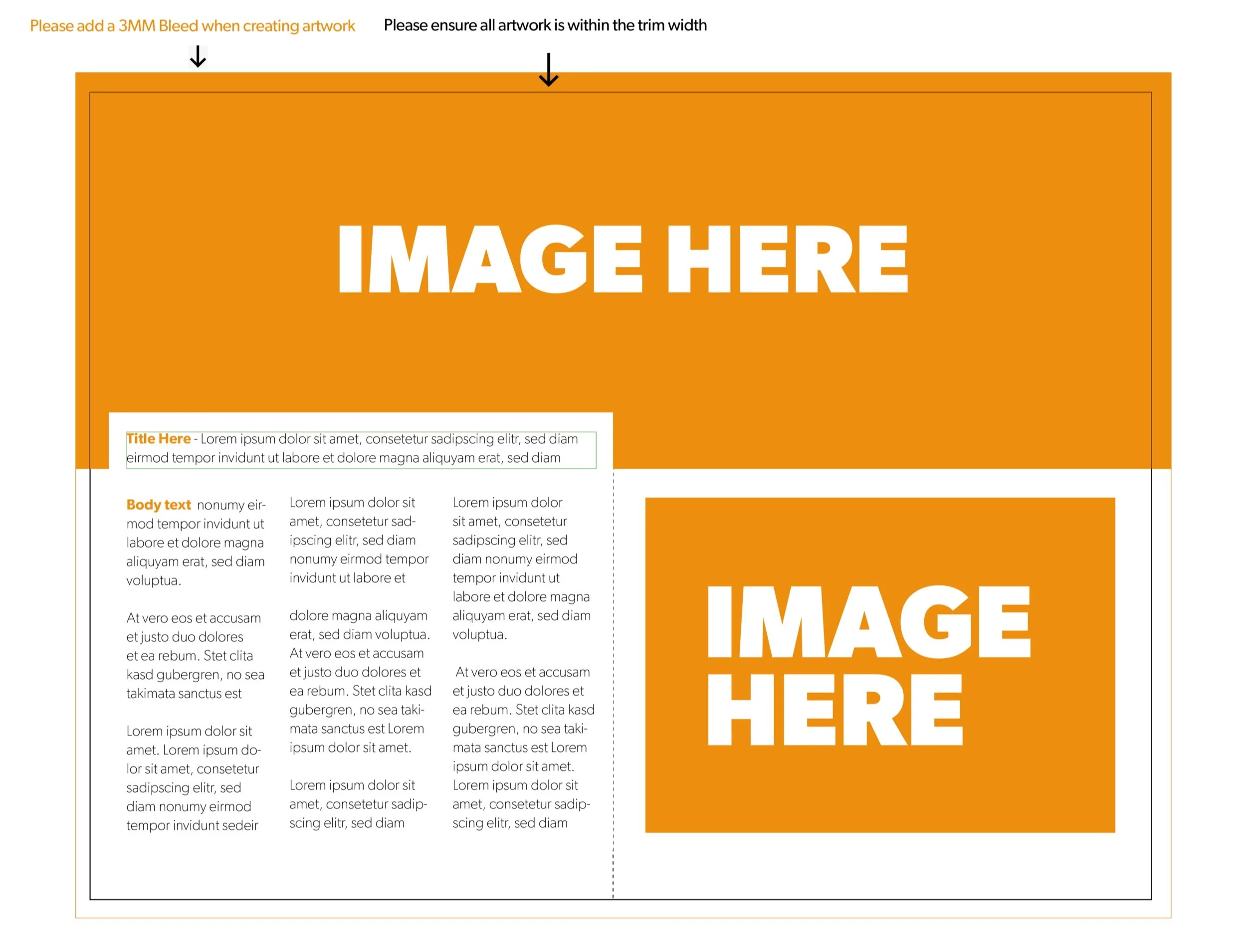 Content that is sent across will be placed on a template following the Warm Welcome theme, below are some examples of how your content will be displayed. Pre-Made Artwork can be sent across in the following dimensions: Height x width (mm) - Type - 262 x 180 - Trim - 297 x 210 - Bleed - 303 x 216